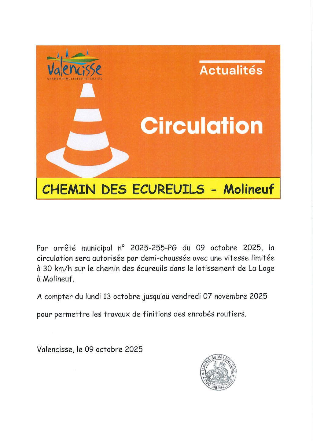 Par arrêté municipal n° 2025-255-PG du 09 octobre 2025, la circulation sera autorisée par demi-chaussée avec une vitesse limitée à 30 km/h sur le chemin des écureuils dans le lotissement de La Loge à Molineuf.