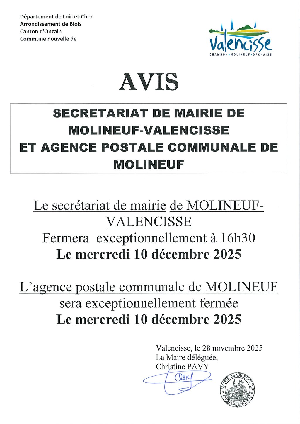 FERMETURE SECRÉTARIAT DE MAIRIE ET AGENCE POSTALE DE MOLINEUF