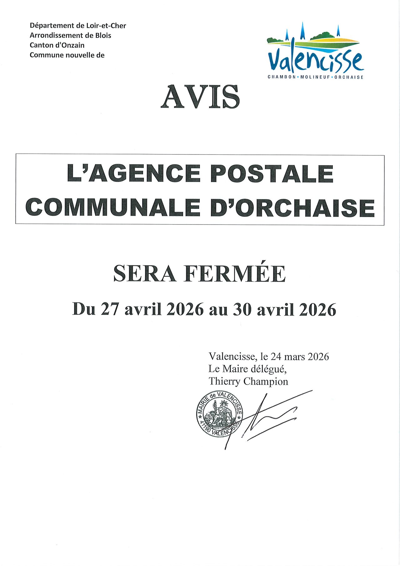 FERMETURE POSTE ORCHAISE AVRIL