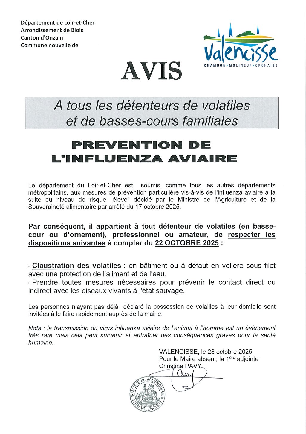 Le département du Loir-et-Cher est soumis, comme tous les autres départements métropolitains, aux mesures de prévention particulière vis-à-vis de l'influenza aviaire à la suite du niveau de risque "élevé" décidé par le Ministre de !' Agriculture et de la Souveraineté alimentaire par arrêté du 17 octobre 2025.