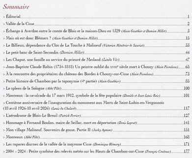 Dans ce n° 28, à côté de la 2e partie très attendue de Mon village Molineuf, souvenirs de gosse vers 1950 par l'artiste Jacky Aymon et de la 4e partie de la Petite histoire de Chambon par la toponymie par Alain Gauthier, l'un des piliers de la revue avec Alain Picouleau qui publie notamment un article sur le château des Bordes à Chouzy-sur-Cisse, vous trouverez des articles sur la généalogie de la famille Chaput liée au prieuré de Mesland, par Linda Vée ; sur le Billieux à Molineuf, par Victorien Ménétrier de Sauriat ; et sur la cavalcade de Monteaux à Onzain en 1912, par Danièle et Jean-Louis Rois, à travers des clichés d'époque. À noter, un hommage poignant à Fernand Boulon, le maire de Seillac mort en déportation en 1944, par Denis Leprat, et une étude de Louis du Chalard sur le monument aux Morts de Saint-Lubin-en-Vergonnois dont une cérémonie fêtera le centenaire le 18 avril 2026. Certains articles raviront les spécialistes d'histoire médiévale, comme ceux sur une charte de 1329 à Averdon et sur la mystérieuse forêt de Blémars, enfin délimitée précisément, tous deux cosignés par Damien Millet et Alain Gauthier. Vous aurez peut-être comme nous un coup de cœur pour le bel article de Patrick Perrier sur l'aérodrome du Breuil, auquel notre encart en couleur est consacré. Les amateurs de biodiversité ne seront pas en reste avec les rapaces à Orchaise, par Dominique Hémery, et 20 ans de relevés météorologiques à Chambon-sur-Cisse, par François Coutoux. Venez aussi passer un moment sur le petit banc près de l'église Saint-Secondin...