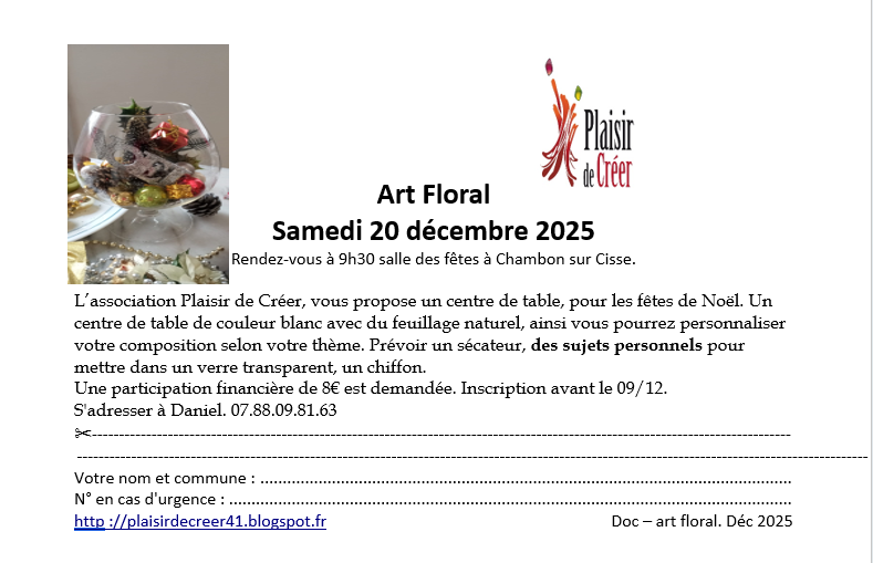 Vous trouverez ci-dessous le coupon pour l'inscription à l'art Floral du 20 décembre à Chambon sur Cisse.