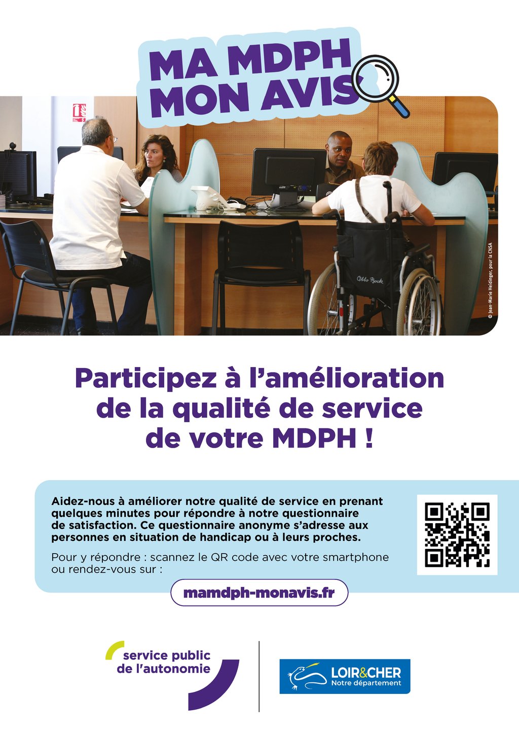 Aidez-nous à améliorer notre qualité de service en prenant quelques minutes pour répondre à notre questionnaire de satisfaction. Ce questionnaire anonyme s’adresse aux personnes en situation de handicap ou à leurs proches.