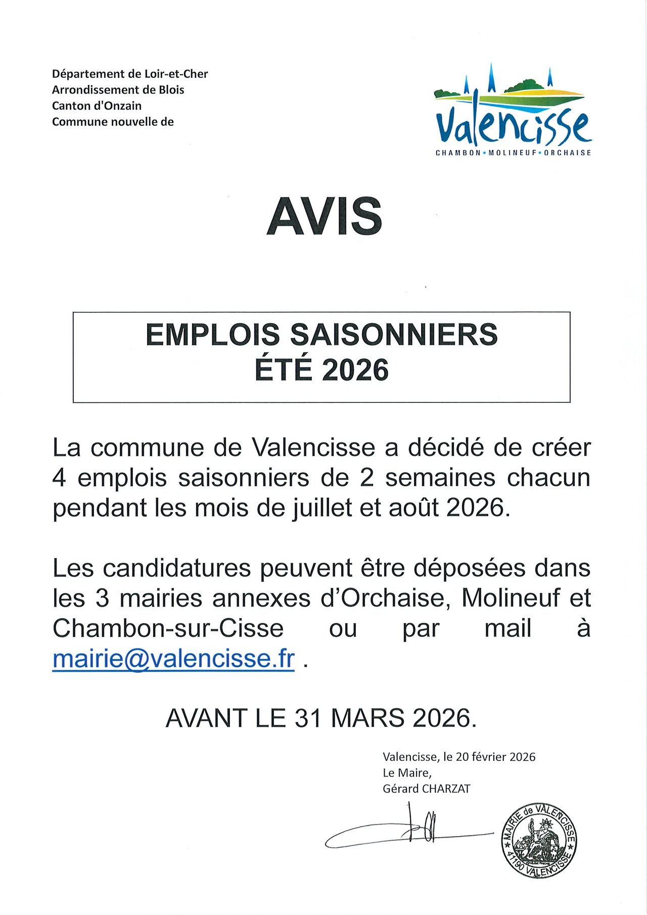Les candidatures peuvent être déposées dans les 3 mairies annexes d'Orchaise, Molineuf et Chambon-sur-Cisse ou par mail à mairie@valencisse.fr .