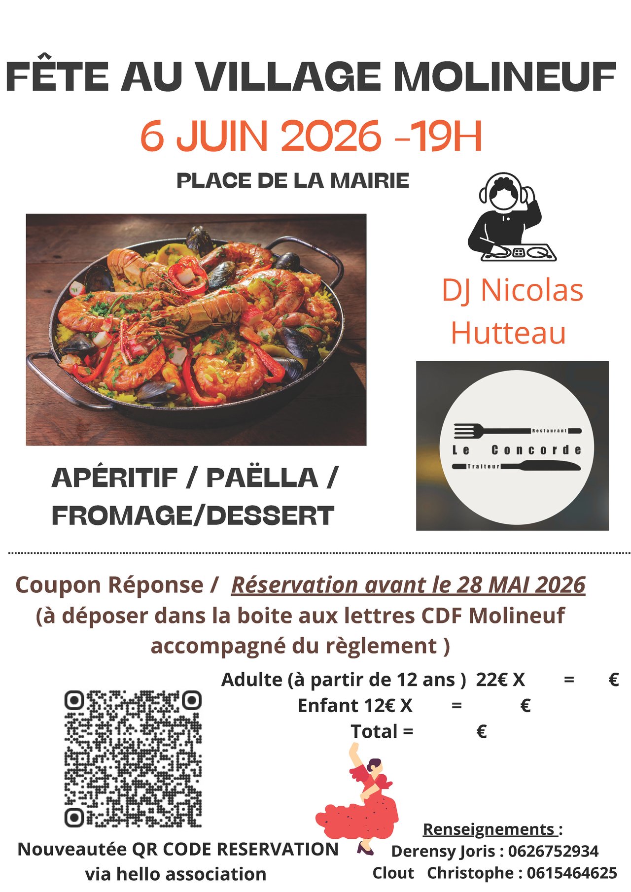 Au MENU: Apéritif ; Paëlla ; Fromage ; Dessert